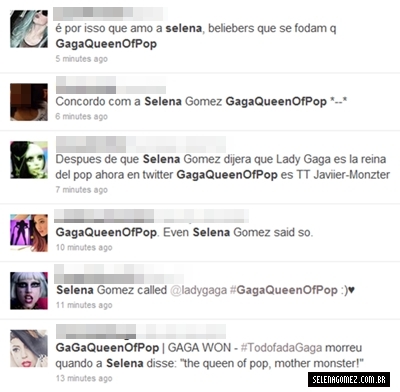 Ontem, no MuchMusic Video Awards 2011, Selena Gomez apresentou Lady Gaga como a “Rainha do Pop” antes de sua performance do hit Born This Way. Agora, a tag “GagaQueenOfPOP” (GaGa Rainha do Pop) ocupa o penúltimo lugar como um dos assuntos mais comentados da rede social Twitter.